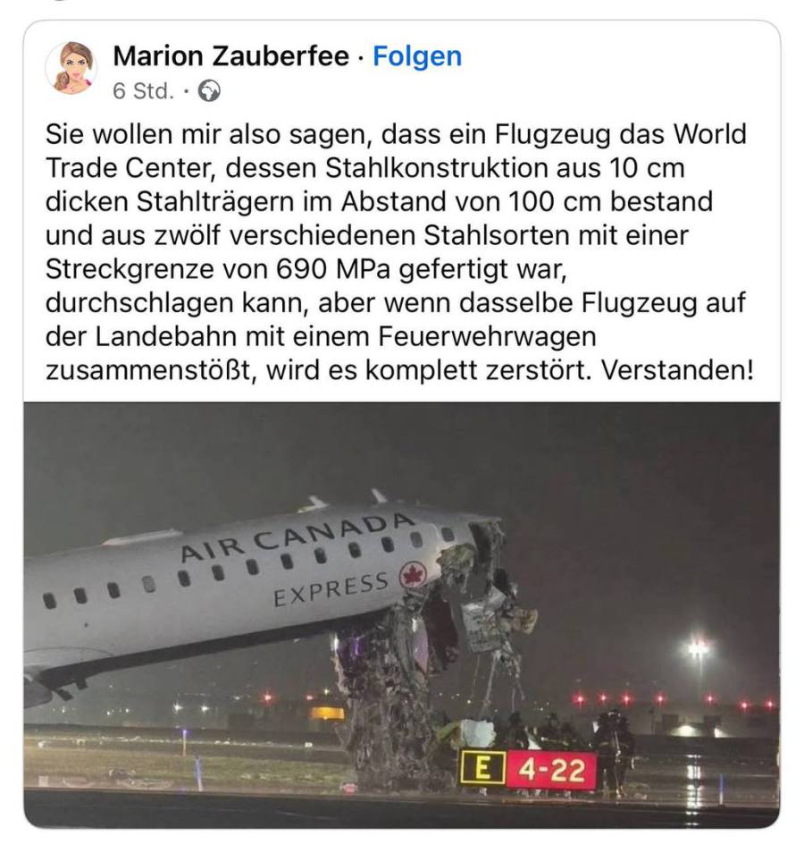 Zu 9/11: Immer wieder ein schöner Vergleich. Schon Regen oder Vögel können Flugzeuge zerstören, aber sie wollen uns ernsthaft weismachen, dass diese Flugzeuge dicke Stahlträger zerstören und Wolkenkratzer zum Einsturz bringen. Solche Menschen, die meinen, uns das verkaufen zu können, müssen doch wirklich ausgesprochen dumm sein….oder eben…….
